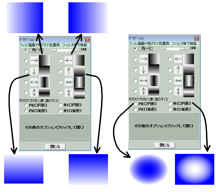 グラデーションウインドウのグラデ−ションの方向のラジオボタンを設定して矩形フィルを実行します、そうすると描画色を使って下図のようにグラデーション適用されて描かれます。