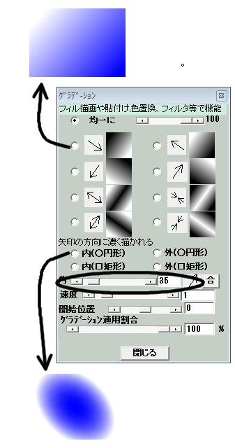 グラデーションは○印の部分のスクロールバーで回転角度を設定すると回転して描くことが出来ます。