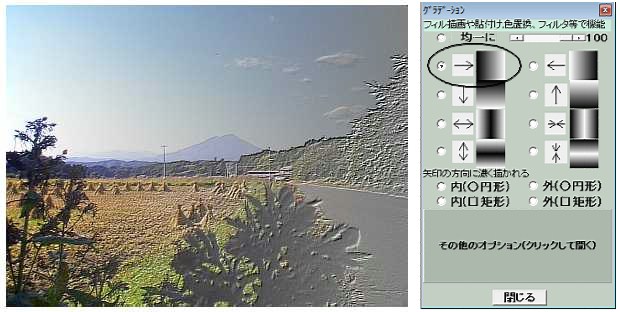 またグラデーションは矩形フィルだけではなく描画ではあらゆるフィルを伴う描画やフィルタ処理や矩形コピー、不定形コピーのペーストや文字の貼り付けその他に適用することが出来ます。