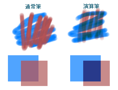 下図は通常筆と演算筆で描いたサンプル画像です、あくまでも好みですが演算筆は透明水彩で描いたような感じになります。筆の描画やフィル描画、文字描画などで機能します。
