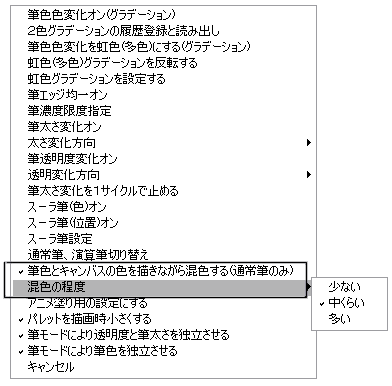 通常筆だけのオプション機能ですがパレットの右クリックメニュから□枠のように「筆色とキャンバスの色を描きながら混色する」をチェックするとやはり筆が透明水彩のように描かれるようになります、程度は3つの程度が用意してあります。