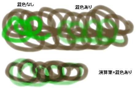 描くと下図のような感じです。混色と演算筆を同時に使うとより透明感が増します、これらのどちらを使うかは好みによりますね。
