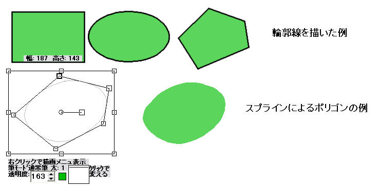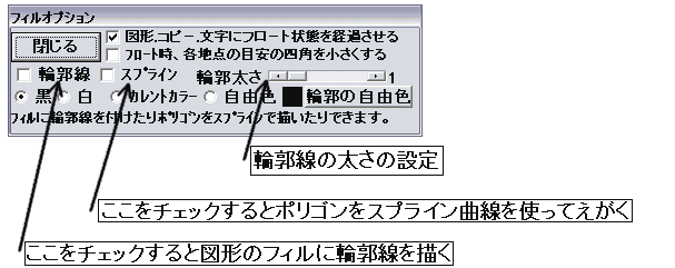 下図の「輪郭線」のチェックボックスをチェックするとフィルの際に輪郭も描きます、「輪郭太さ」のスクロールバーで輪郭の太さを変えることが出来ます。