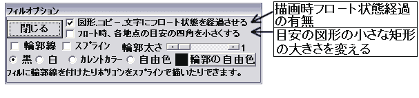 下図のように上2つのチェックボックスでも描画時フロート状態を経過するか否かを設定できます、また目安の図形上のマウスによって図形の形をかえることができる小さな矩形の大きさを設定することもできます。