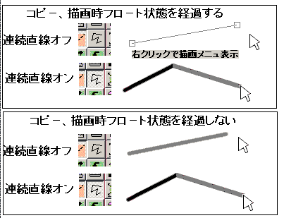 図形描画にフロート状態を経過する時の直線描画のインターフェイス(Hyper-Paintチュートリアル 使い方 講座) 直線の場合図形描画にフロート状態を経過するのは「コピー、図形描画にフロート状態を経過する」がチェックされていてかつツールボックスの「連続直線」ボタンがオフになっている時だけです、それ以外は通常の描画になります。 つまり下図のようになります。