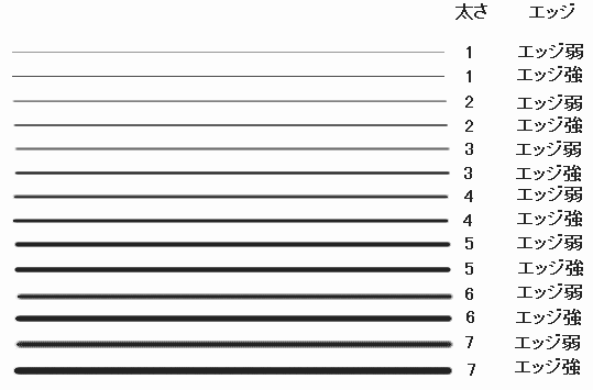 Hyper-Paintの筆は細かく筆の太さを変えられます。特に太さ7以下では1Pixel単位で太さを変えられますが更に筆のエッジの強弱を変えることにより見かけ上0.5Pixel単位で太さを変えることができます。筆のエッジはメニュの描画の「筆のエッジ」で変えるかあるいはパレットの筆の太さを表示している部分を左クリックすることにより変えることができます。