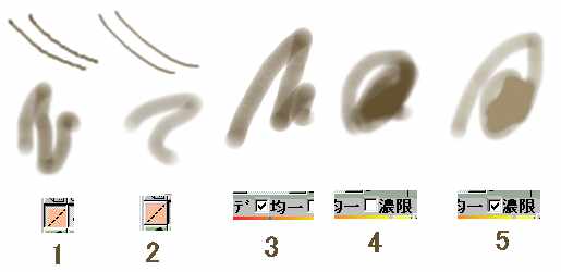 まず通常筆で説明します。下図の1のようにフリーハンドで補完を行わないと細い筆を使って素早く描くと筆が繋がらず切れ切れに描かれたり、またコンピュータはデジタルですから画像の位置が全て整数でしか表すことができませんので多少ギザギサになりやすい傾向があります。しかし図の2のように補完ボタンを押し上げて描くと補完をおこなうようになり割合滑らかに繋がるようになります。また3のように「均一」をチェックすると筆のエッジが硬い筆となります。通常は4のように透明度が小さくても同じ位置を繰り返し描くとどんどん濃くなっていきます。しかし5のように「濃限」をチェックしていると同じ場所を繰り返し描いても一定の濃さになるとそれ以上濃くなりません。