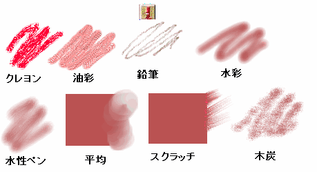 下図はクレヨンウインドウ内の筆です、クレヨン筆と油彩筆は透明度を大きくして濃く描いたほうがよりそれらしくなります。鉛筆筆はだいたい透明度が100前後で細めの筆で描いたほうが良いでしょう。水彩筆水性筆は透明度70前後で太めの筆のほうがよいでしょう。