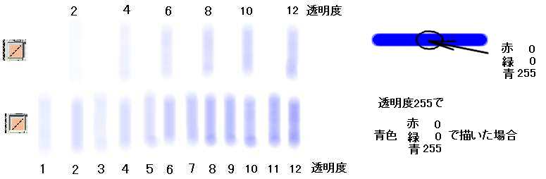 Hyper-Paintのぼかし筆は他のペイントソフトとは違って大きくぼかす程度を変えることが出来ますので描画の大きな助けになります。同様に指先筆も強度によって大きくひきづる程度が変わります。下図の数字は強度(透明度)を表します。