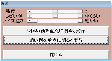 なお最新版では従来の陽光フィルタを実行するのは「明るい所を重点に明るく実行」ボタンを押して実行するようにして新たに「暗い所を重点に明るく実行」を取り付けました。これは画像の中に暗い部分かあって従来の明るさを変えるフィルタで明るくした場合に明るい部分がより明るくなって白く飛んでしまいますがこのフィルタを使うと画像の中の暗い所だけを明るくします。この時明るくしたくない部分をマスクする必要はありません。