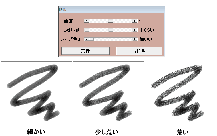 陽光(光彩拡散)フィルタにノイズの荒さを5種類用意した。また調整する部分が多くなるとメニュで行うのは使いにくいと思うので陽光(光彩拡散)フィルタのウインドウを表示して調整し実行できるようにした