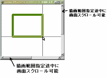 画像を編集する際に必ずしも1画面に収まる大きさの画像だけを編集するとは限りません、もし1画面に収まらない大きな画像を編集している時には、例えば矩形や楕円、直線、ポリゴンフィルを描く時に表示されてる範囲を越えた範囲を描画したい場合他の描画ツールの操作のように始点でマウスボタンを押してドラッグして範囲を指定する方式では範囲指定の途中で画面をスクロールして表示されている範囲を移動することができません、確かにソフトによっては画面の端にマウスポインタが移動すれば自動的にスクルールするソフトもあるようですが、この場合自動的というのが曲者で思ったよりも行き過ぎたり、足りなかったりとなかなか扱いにくかったりします。