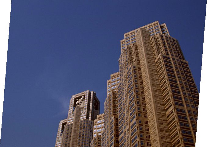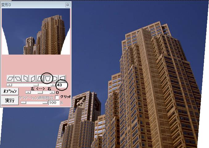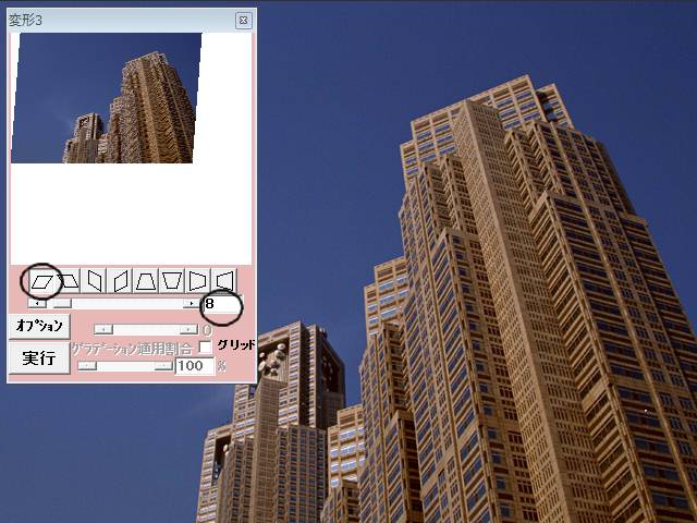 下図の画像のように全体に傾いた画像に台形補正をする前に平行四辺形補正でこの傾きを補正してその後台形補正をすると有用です。下図の画像では○印のボタンを押し下げて強度を 8 にして実行しました。