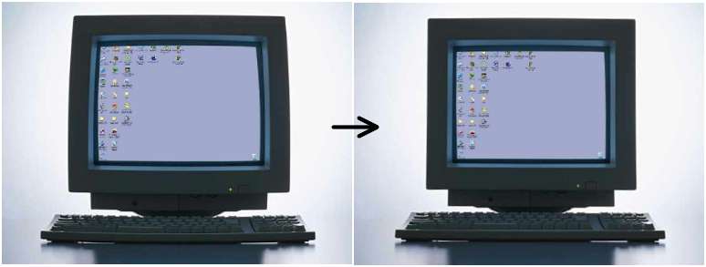 例えば下図の左のような画像は台形変形の中心が中央ではうまく補正できませんが、台形の中心を左に移動させると下図の右のように補正できます。