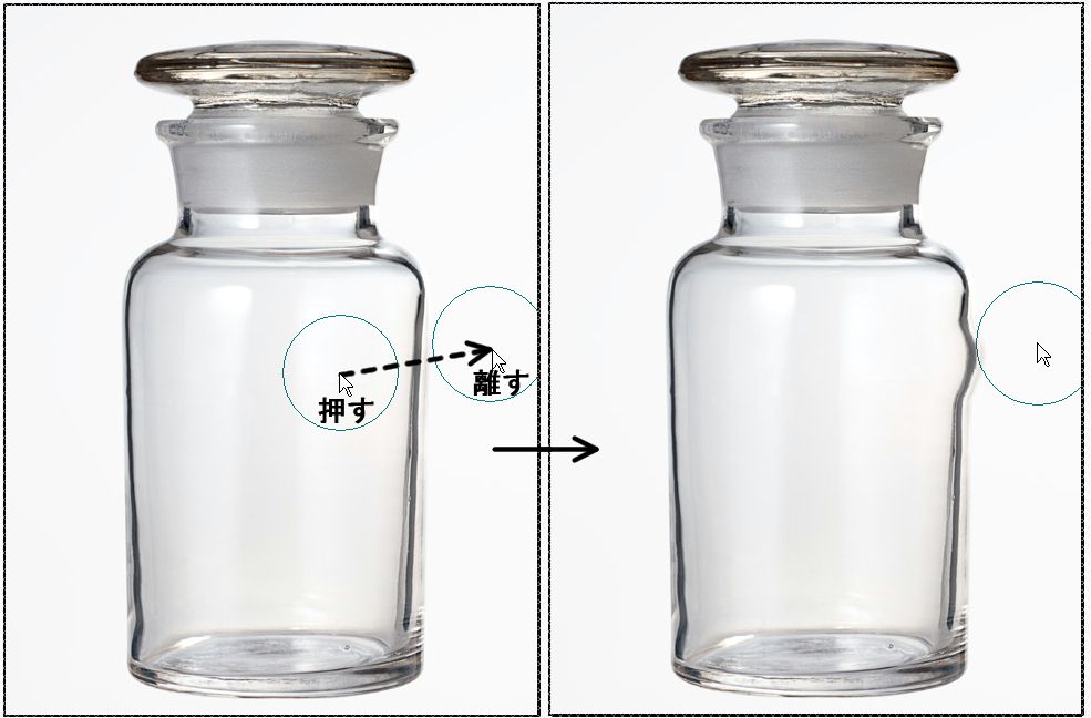 レンズ変形と波紋変形はキャンバス上で始点終点を指定して範囲を指定すると画像の一部だけを変形することが出来ます。