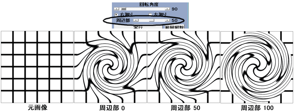 渦巻きの周辺部の回転の調整ができます数値が小さいと周辺部の回転が少なくなり数値が大きいと回転が大きくなります。