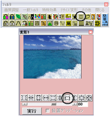 フィルタ選択ウインドウを開き○印のボタンを押して樽型変形フィルタを開きます。次に