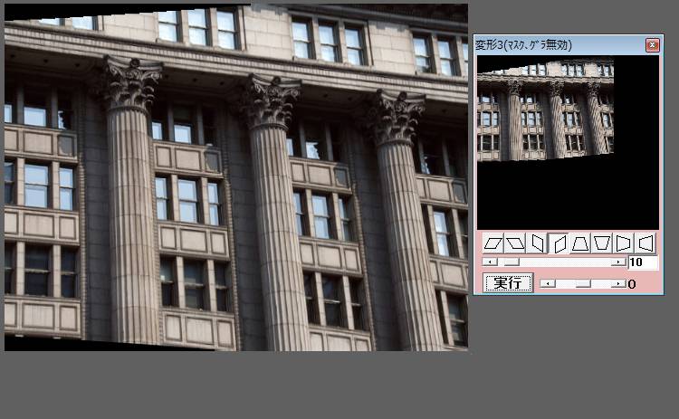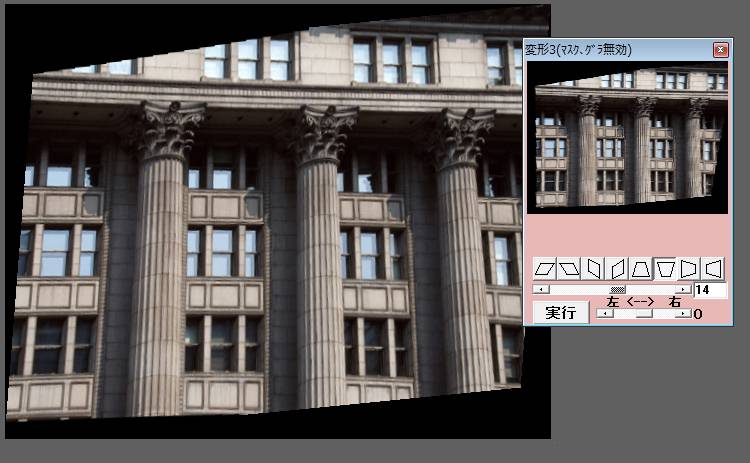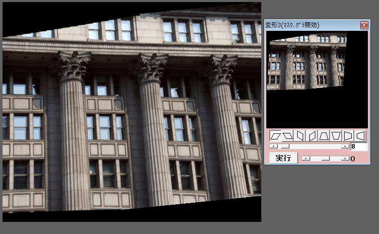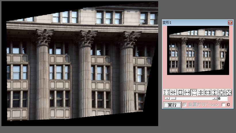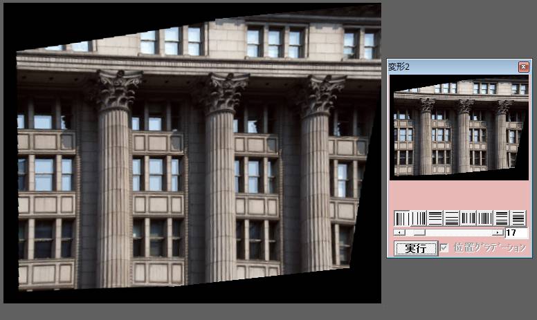 そうすると下図のような画像になります。この画像の柱の太さが右側が縮まったように幾らか細くなっていますので変形2のフィルタの右側に行くに従って間延びさせるボタンを押し下げて強度17で実行してみます。