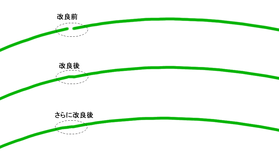 描画後に確認してみると下図上のように完全には閉じられていませんでした。下図下は改良してまあとにかく閉じられるように改良しました。まだ若干ズレたぽい所が気に入らないが(後述のレベルとはこういうレベル)その後下図のようになんとかズレが分からないように改良しておいた。