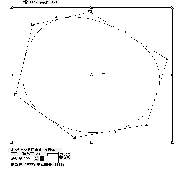 スプライン曲線はベシェ曲線とちがって作画後に曲線の変更ができないという誤解がありますがHyper-paintのスプライン曲線は作画後に地点を変更したりポイントの追加や削除なども簡単なので思いどおりの曲線を描くことができます。