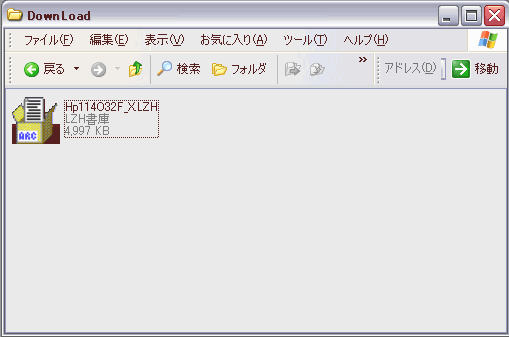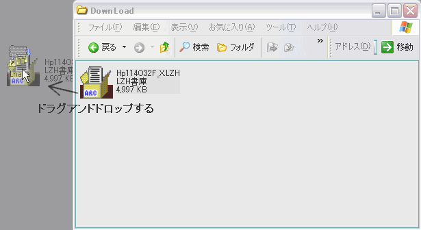 LHasa.exeなどの解凍ソフトにダウンロードした(Hp114O32F_X.LZHなど)ファイルをドラグアンドドロップして解凍します。ドラグアンドドロップとはファイルをクリックしてボタンを押したまま移動して移動先でボタンを離します。