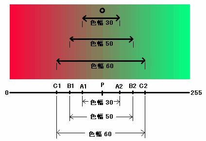 上の図で「色幅30」ではA1からA2の範囲、「色幅50」ではB1からB2の範囲、「色幅60」ではC1からC2の範囲を塗ることができます。
