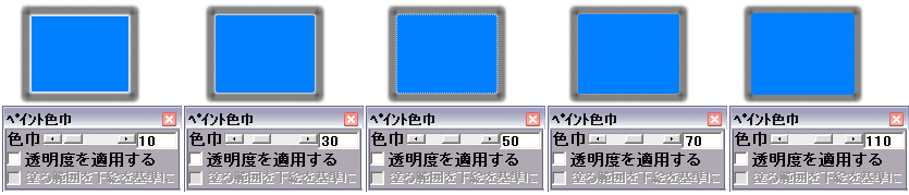 下図は輪郭が少しぼけた図形に色幅を変えて塗り潰した例です色幅を大きくすることによってより広い範囲を塗ることができることが分かると思います。