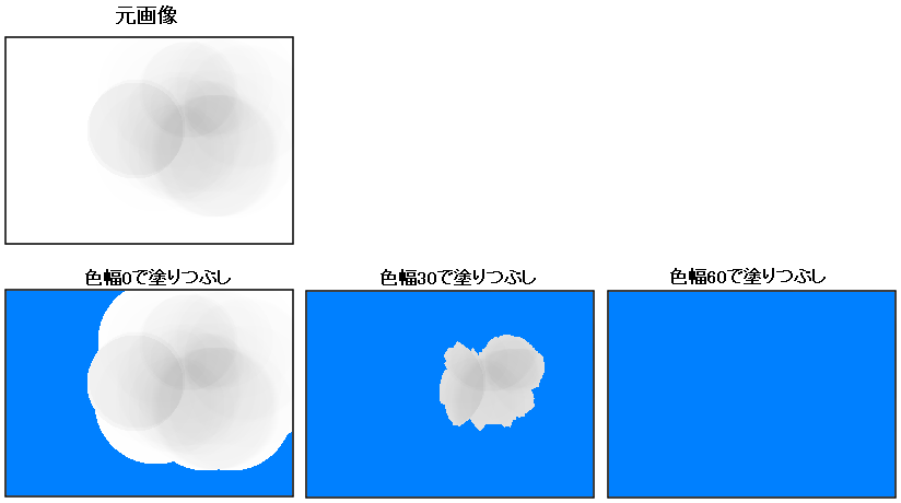下図で丸印の位置で塗ったとします。そうすると「色幅」が30、50、60の時それぞれ矢印の範囲を塗ることができます。色幅を大きくすればするほど塗ることが出来る範囲は広くなります。こういうふうになる現象の考えられる原因としてはJpeg画像を開いて塗りつぶした場合がありますJpeg画像は輪郭周りにノイズが発生する場合がありますのでノイズ部分が塗りつぶし時に残る場合があります、こういう場合も色幅を大きくするなどして対処します。