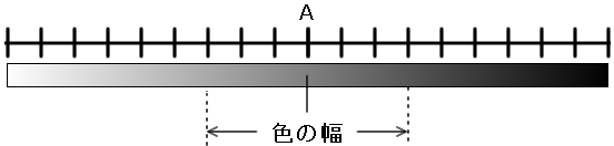 色幅を簡単に理解するために次のことを考えて下さい、例えばある色Aがあるとします、その色の薄い色が下図の左側の方向、濃い色を右側の方向とします、色の幅とはその色の濃さの範囲の幅と考えると分かり易いと思います。