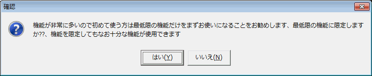 Hyper-Paintは非常におおくの機能をもっています。そのため画像関係のソフトを使ったことのない人や知識が不足している人がとまどう場合があるようです。そのために各ボタンや他のコンポーネントにはポップアップヘルプが表示されこれを読めば操作に迷うことの無いようになっています。またサイトには非常に詳しく丁寧な解説がありますがそれでもこれらを読まない人、読んでも理解できない人がいるようですので初回時に下図のように機能を限定して機能を少なくすることができます。自信のある人は限定する必要はありませんが自信のない人は限定して使ってください。