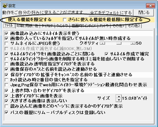 下図のように設定ウインドウの○印の部分のチェックボックスでも機能を2段階に限定したり解除することができます。