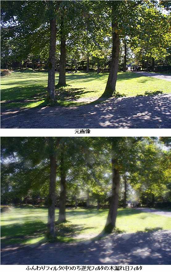 木漏れ陽フィルタ 逆光フィルタの「実行2」ボタンを押すと下の例のように木々の葉っぱの間から日の光が漏れているような写真を作ることができます、このフィルタは逆光ぎみに撮ったポートレートなとの人物に使っても美しい効果を得ることができます、強度を変えることができます。