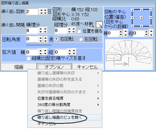 図形の繰り返し機能も実際にどのように描かれるか想像しにくい場合があるかもしれません。そういう時はメニュの「繰り返し機能のビュを開く」をクリックしてください。