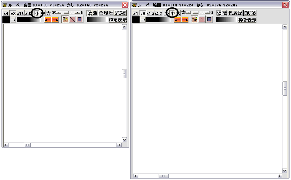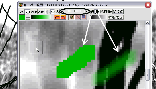 ルーペの筆の太さを変えるには下図の○印の部分のスクロールバーで行います、初期状態では「濃」のボタンが押し下げられていますがこの場合はルーペ筆は濃く不透明に描かれますもし「薄」のボタンを押し下げると下図右のように透明に描くこともできます。ルーペの筆色は通常のパレットから選択することができます。