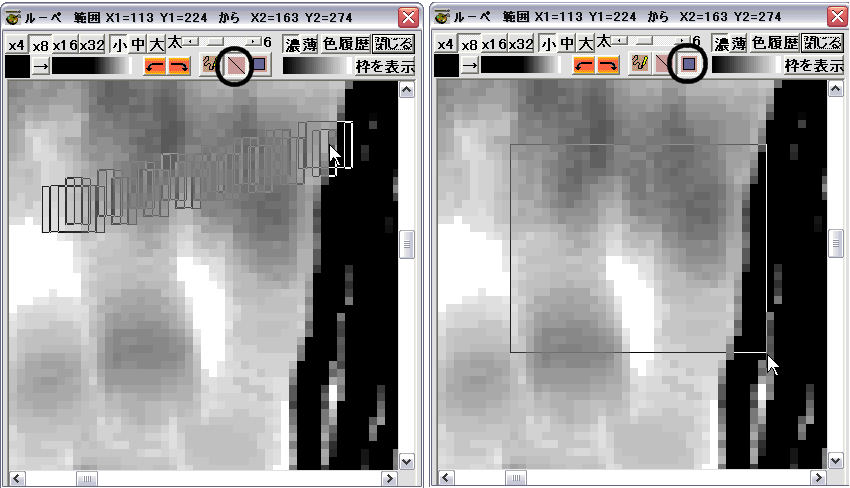 そうすると下図のようにルーペウインドウが表示されルーペの中に画像の一部が拡大されて表示されます。ルーペの中で描画を行うことによって画像の修正を行います。画像のどの部分を拡大表示するかは下図の左側に表示されている□の枠をドラック゛して移動することによって行います、またはルーペの縦横のスクロールバーを操作しても移動することができます。