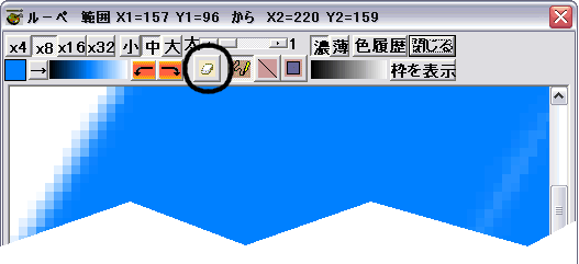 新しいバージョンでは下図のケシゴム筆ボタンを押し下げるとルーペでケシゴム筆を使うことができます。