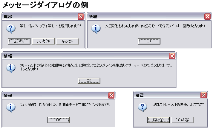 Hyper-Paintではユーザーが操作中に操作を間違える可能性がある場合メッセージダイアログを表示して確認を求めます。例えばHyper-Paintでは各種筆モードと各種描画モードを組み合わせて描画することができますが、筆モードがパターンあるいはぼかし筆モードである場合に筆モードを忘れていて通常のモードであると勘違いし矩形フィルを行ったとします、この場合はメッセージダイアログによって現在の筆モードを知らせ、適用するか否か問い合わせてきます。このようにHyper-Paintはユーザーができるだけ間違いを起こさないように配慮して設計されています。全てではありませんがメッセージダイアログ表示は設定によって表示しないようにすることもできます。