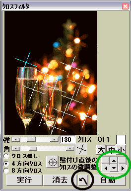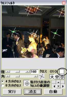 フィルタウインドウのクロスフィルタを開きます、「貼り付け」ボタンを押し下げ、プレビュ上でクリックしてクロスを貼り付けます。大きいクロスを使いたいので「大」のボタンを押し下げ強度を142にして次ぎに「実行」ボタンをおして実行します。結果が下の画像になります。