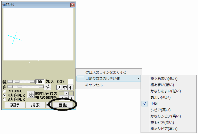 下図の○印のボタンを押すと自動でクロスを貼り付けます、この自動クロスの貼り付け数などはわりと微妙ですので画像の絵によって下図のように右クリックメニュから「しきい値」の調整ができるようになっています。