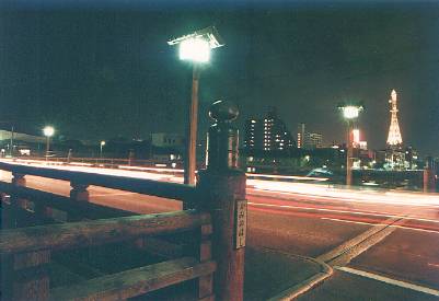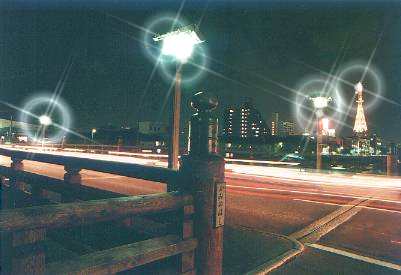夜の橋の写真ですが、これにクロスフィルタを使ってみたいと思います。通常のカメラにもクロスフィルタというものがあり、クロスを回転することができます。クロスは発光体もしくは反射物に現れます。この写真の場合街灯や鉄塔の灯り、建物の窓の灯りなどです。