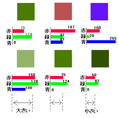 緑成分が大きいと緑がかった色になり赤成分が強いと赤っぽい色になります、赤、緑、青の各成分の大きさの違いが少ないとくすんだ色になりますし、赤、緑、青の各成分が大きいと明るい色になりますし、逆に小さいと暗い色になります。