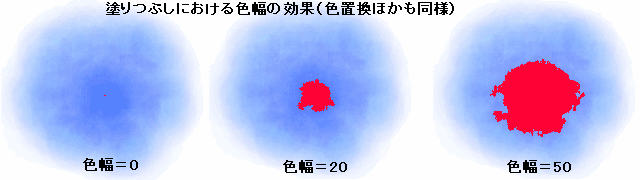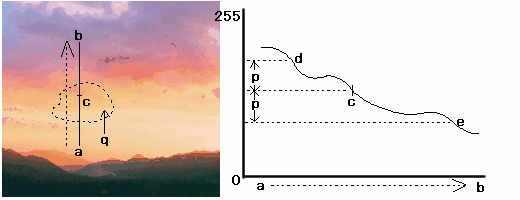 例えば下の画像のaからbまでのラインをみた場合色の値の変化が右下図のようだったとします。そしてc地点で塗り始めたとします。このときの色幅をpとするとc地点からpだけ値の小さいeからc地点からpだけ値の大きいdまでの範囲が塗ることができます。左下の図で言えば例えばqの破線で示した範囲が塗られることになるわけです。色幅pを大きくすると塗られる範囲は広くなりますし小さくすると当然狭くなります。このような色幅の考え(概念)はペイント以外にも色置換や矩形コピーの抜く色(透明色の幅)その他多くの場面で必要になりますので是非覚えておいてください。