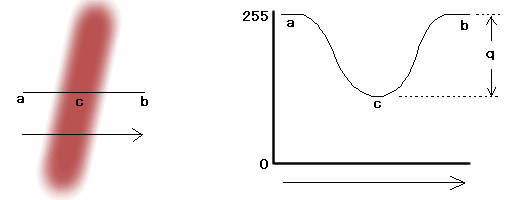 下の図は筆で描いた画像ですが、Hyper-Paintはフルカラーを扱うソフトですから筆ですっと描いただけでもその中にはある幅を持ったデータが存在します。例えばaからbまでのラインの部分で見てみると右下の図のようになります。つまりaからbまでのラインの部分にはqの範囲内の多くの値を持った点(ピクセル)が存在するわけです。このことはフルカラーの画像のある狭い範囲を取って見た場合でも一見単一色に見えてもそれぞれの点がバラツキを持った値を持っていることが普通ですからペイント(塗りつぶし)を行った場合にはほんの一部の範囲しか塗ることが出来ません。Hyper-Paintではそのためにあるバラツキを持った範囲を塗ることが出来るように色幅という考えを作りだしました。