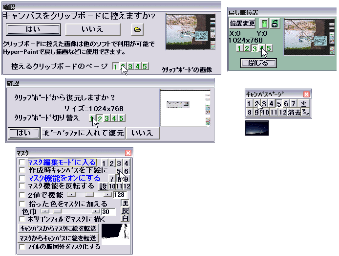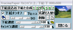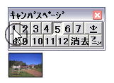 各ページにどんな画像があるかどうかの確認方法 Hyper-Paintでは幾つかのウインドウやダイアログで画像のページを切り替えることができます。各ページにどんな画像があるかどうかを確認するには下図のようにページ切り替えボタン上にマウスポインタを置きます、そうするとそのページの画像のサムネイルが表示されます。 この機能はトレーシングペーパーウインドウだけではなく下図のようなウインドウで機能します。