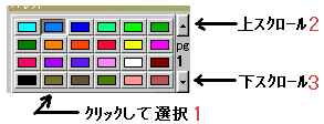 パレットに登録できる色数は120色です。2と3のボタンをクリックするとスクロールすることができます。1の部分を左クリックして色を取りだします。右クリックすると現在のカレントカラーをパレットに登録することもできます。