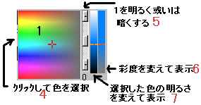 下図のパレットをクリックすると色を拾うことができます。5のスクロールバーを動かすと1の部分の明るさが変わります。5の部分の右側はカレントカラーを明るい色から暗い色で表示してそこからも色を拾うことができます。6の部分はカレントカラーを彩度を変えて表示します、ここからも色を拾うことができます。通常筆色はここから色を拾って作成します。