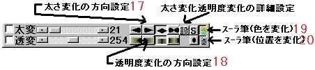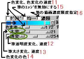 ここは筆のオプションの設定です。11をチェックして「色変速」のスクロールバーを調整すると2つの色の間で描画色を徐々に変化させながら描画を行うことができます。14は色変化の色を表し登録することもできます。13をチェックすると筆の太さを変化させながら描くことができます、変化の速度はスクロールバーで変えることができます。12は筆の透明度を変化させて描くオプションです変化の速度はスクロールバーで設定します。