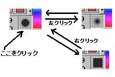 筆の太さを変えるスクロールバーの右側の筆の太さを表示している部分を左クリックすると筆のエッジが変化します。また右クリックすると筆の形が円形或いは方形に変化します。