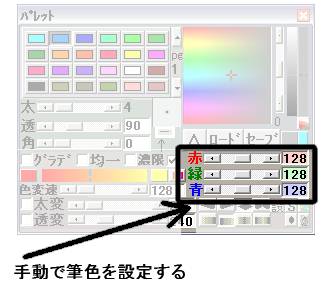 より細かく手動で筆色を設定するには下図の□枠の赤、緑、青のスクロールバーを調整して行います。