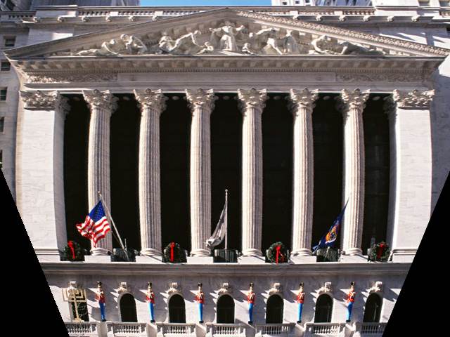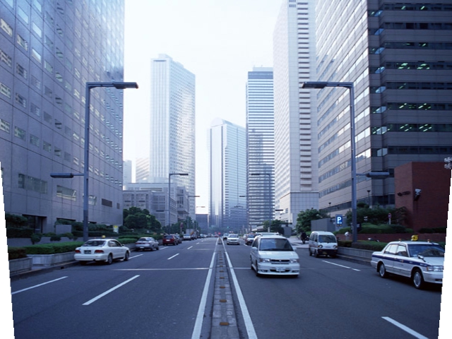 もう一つの方法は下図のように斜めになっている建物を台形補正フィルタの中の平行四辺形フィルタで傾きを修正しておいて次に台形補正をする方法です。